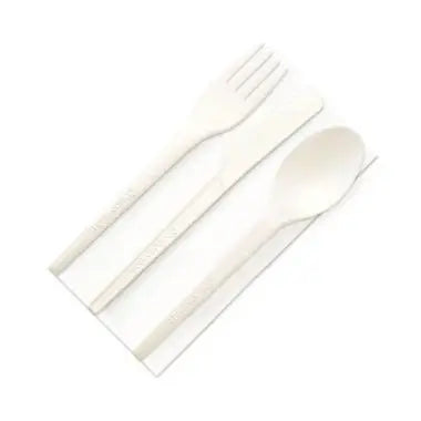 Posate monouso imbustate singolarmente. BIS: forchetta + coltello + tovagliolo. TRIS: forchetta + coltello + cucchiaio + tovagliolo. Disponibile sia bianca che trasparente. Confezione da 50pz.