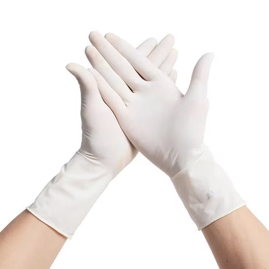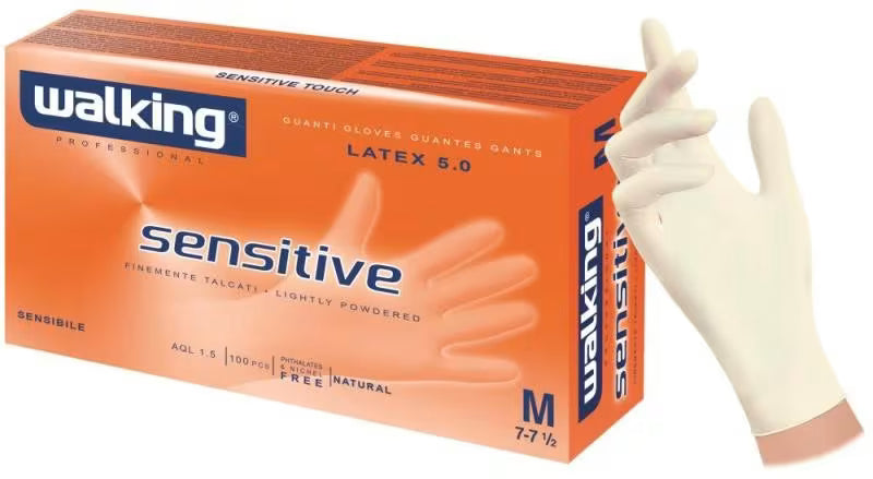 Guanti monouso in lattice colore bianco, peso circa 5,0 grammi per guanto (taglia M, valore produttore) e dotati di polvere interna (talcati) per facilitare l’uso. Versione professionale tipo DPI/DM, confezione standard box da 100 pezzi. Il guanto è ambidestro, realizzato in lattice naturale, con finitura liscia o leggermente testurizzata a seconda variante.
